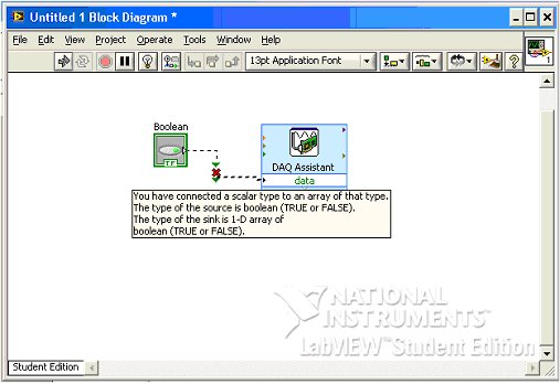 Connect the new Array function (containing the Boolean Push Button) to data input of DAQ Assistant function. This time the link will show no error.