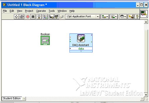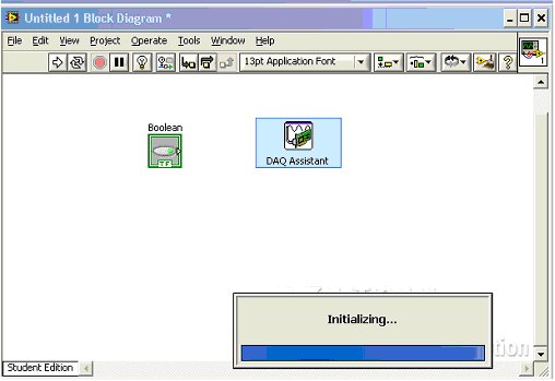 Place adequately the DAQ Assistant function on the Block Diagram workspace. DAQ Assistant will be immediately initialized