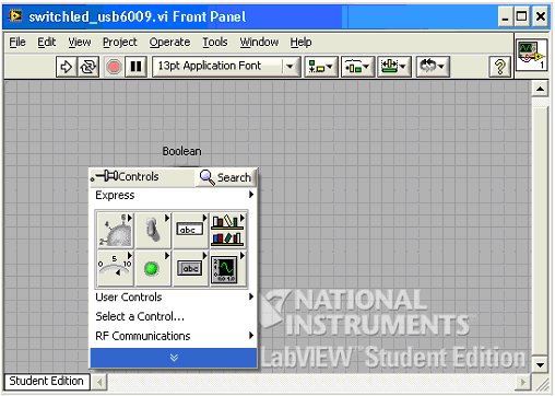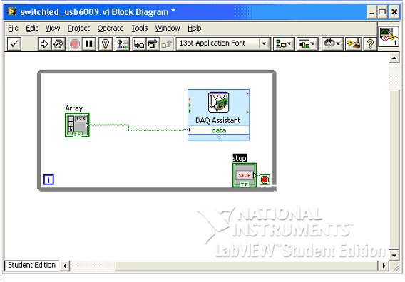 Before doing anything else, it is safe to save the VI. Under File menu of the Block Diagram, choose Save as and save the VI as switchled_usb6009.vi