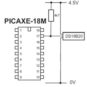 Temperature sensor Maxim DS18B20 is added to the AXE050 board reads temperatures. The advantage of using Picaxe18M is that the same ports are used for control and programming.