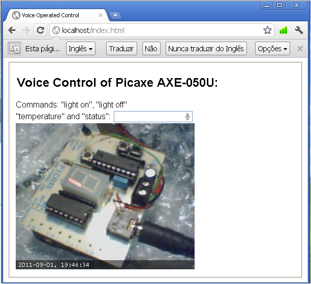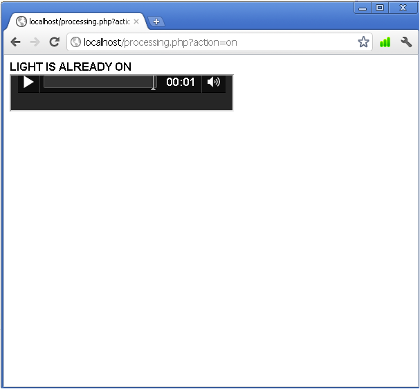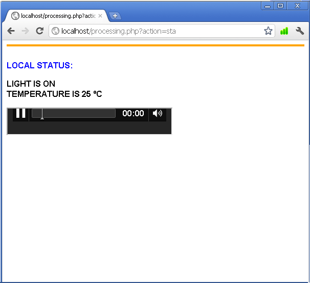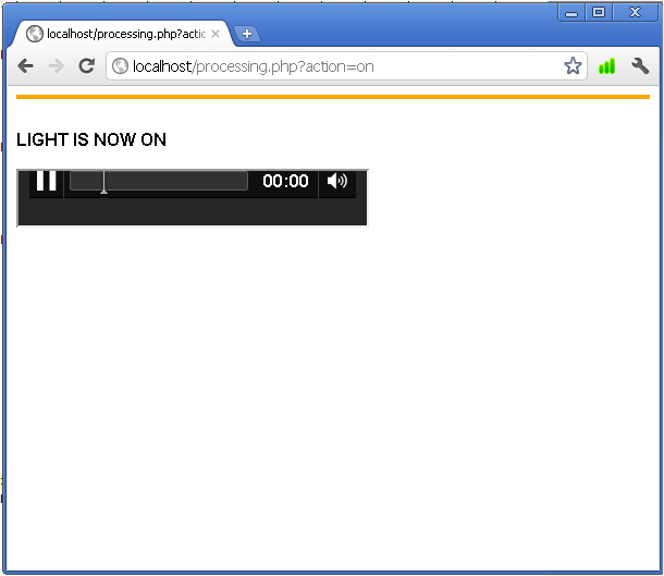 Say the words “light on” and if the answer is right processing.php link will be opened. The browser records your voice input, it contacts Google Servers to do the translation into text for you, and the value will be put in the text field. The page processing.php will be opened if everything is OK as shown below: