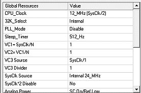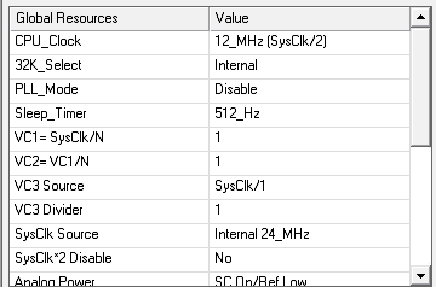 In Gobal Resources change the clock to 12_MHz (Sys_Clk/2), leaving out the rest of parameters as they appear: