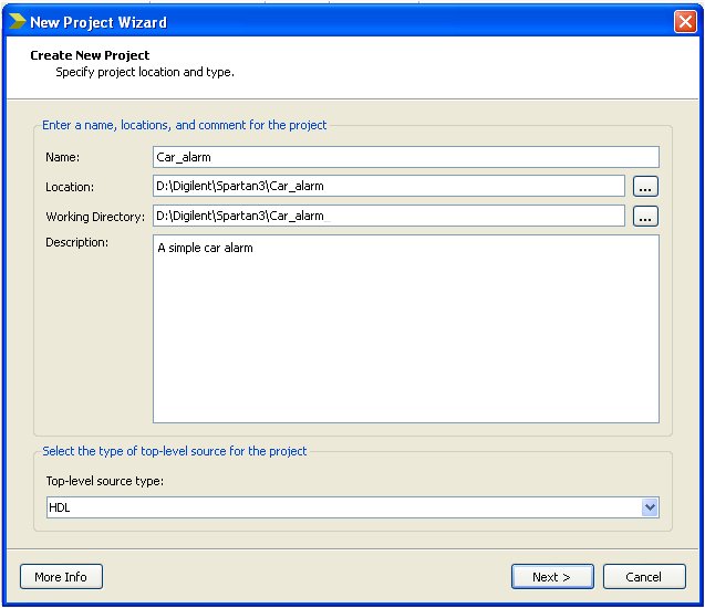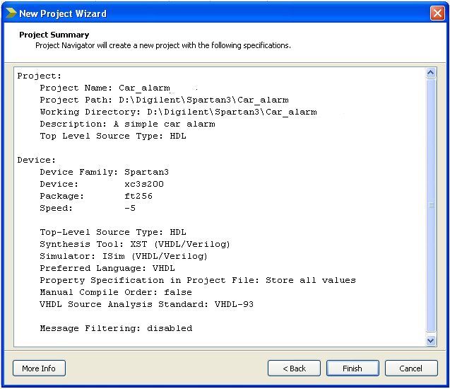 Implement a simple car alarm on a Xilinx Spartan 3 Starter kit board from Digilent, using the VHDL code exported from Multisim 12.0 in our first part of this tutorial,