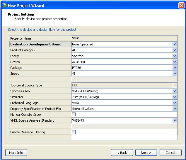 Launch Xilinx ISE Design Suite, get into the Project Navigator, and start a New Project pressing the button for New Project. Xilinx ISE Project Navigator controls all aspects of the development flow of our FPGA. We will use it to launch all development tasks.