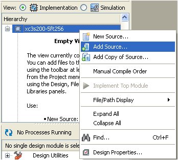 We will add Car_alarm.vhd source (from part I of this post) , by pressing with the right button of the mouse on XC3S200-5FT256 and Add Source: