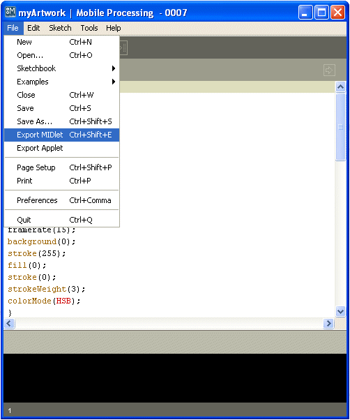 In the main dropdown menu choose File -> New and cut and paste the following code, or write it in Mobile Processing sketch workspace: