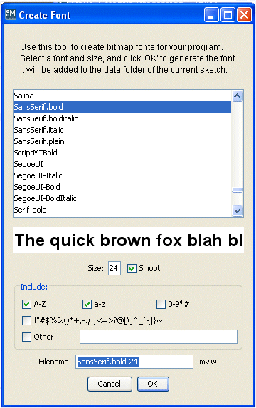 We will choose SansSerif.bold-24.mvlw and include A-Z and a-z characters. If we do not do this procedure our emulator will throw Java exception error. The emulator does not how to display fonts.