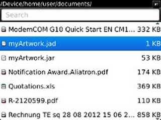 Open the Files folder and navigate to the documents folder. In my Blackberry I found it in File Folders -> Device -> home -> user. In documents folder within user folder, you will find myArtwork.jad and myArtwork.jar (in case you have not downloaded the jad file as mentioned above in which case jar file will be downloaded from Web). Select myArtwork.jad: