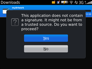 Normally you would press button No, or at least you ought to do so. We will click Yes button, and proceed with the installation. Eventually without any errors, you will get the following reassuring pop up window in your Blackberry: