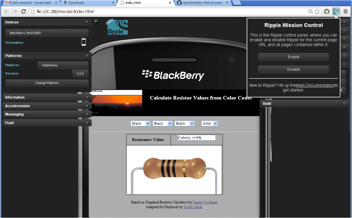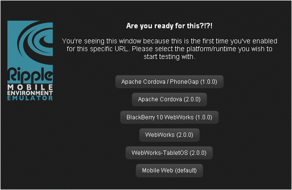 Now open index.html in Chrome. In first run time of Ripple, after enabling, it will be asking you the platform you want to run the page. Choose WebWorks (2.0.0).: