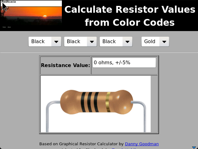 We are now ready for our App. Our App will be a “Resistor Code Calculator” based on Danny Goodman’s quite old, and still popular, “Graphical Resistance Calculator”. You can view and play with the Resistance Calculator visiting Danny’s web application at: