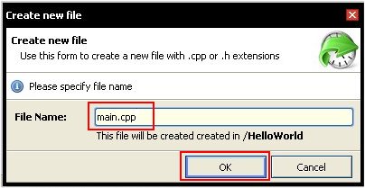 After adding new file, click on the main.cpp file in your new program, to open it in the file editor window. This is the main source code file in your program, and by default it is empty. Write the following program.