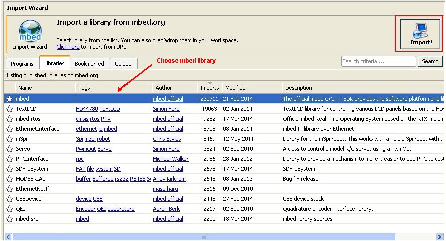 The other item in the program folder is the mbed library – this provides all the useful functions to start up and control the mbed Microcontroller, such as the DigitalOut interface used in this example. Right-click on HelloWorld, choose Import Library… and From Import Wizard…